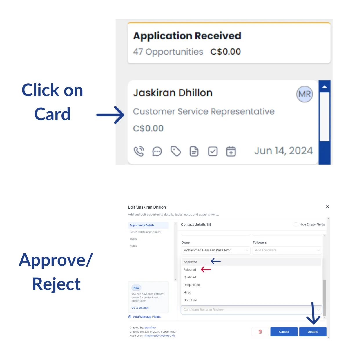 After checking candidate's submissions We can Approve/Reject directly from the email we got or also from CRM system